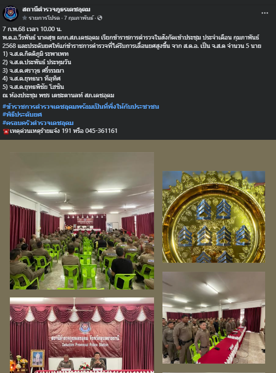 พ.ต.ต.หญิง กมลรัตน์ ไชยขาว สว.อก.สภ.เดชอุดม พร้อมด้วยข้าราชการตำรวจจิตอาสา เจ้าหน้าที่ตำรวจจราจร และนักเรียนนายสิบตำรวจ ร่วมกิจกรรมทำบุญตักบาตรในโครงการถนนสายวัฒนธรรม ณ วัดแสงเกษม ต.เมืองเดช อ.เดชอุดม